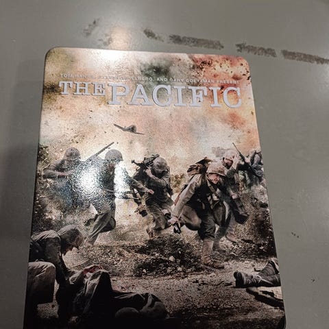 The Pacific DVD sarja metallisessa rasiassa. Kissatalous, Muhoksella keskustaajamassa. Myynnissä myös muualla.