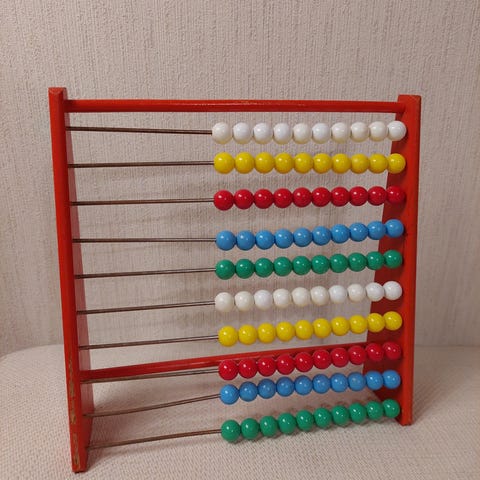 Helmitaulu jossa 9 riviä värikkäitä helmiä ja puinen runko. Ollut hyvä lelu pienille lapsille ja vauvoille, jotka jäävät ihmettelemään väriloistoa ja liikkuvia helmiä.