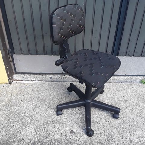 Työtuoli, jossa musta ja sininen kangaspäällyste. Tuolissa on pyörät ja säädettävä korkeus. Sopivin noin alakouluikäiselle.