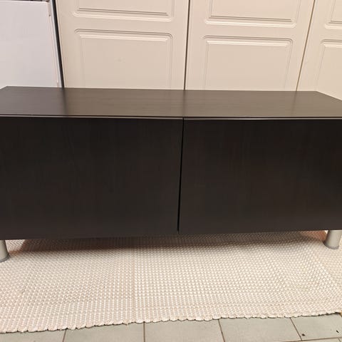 Ikean Bestå tv-taso. Tammen värinen runko, kiiltävät ovet ja metalliset jalat. Pientä kulumaa kannessa, muuten siisti. Paiholassa, vain nouto.