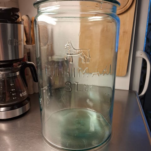 Riihimäen Lasin (Ihanne) narupurkki. Vetoisuus on 5 litraa. Jonkin verran käytön jälkiä. Halkaisija on 18 cm. Korkeus on 26 cm. P.s. Valosarja on myös kaunis purkin sisällä.