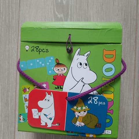 Dominopeli seuraaville pelaajille. Muuten hyvässä kunnossa, mutta laatikon kansi repsottaa kulmasta (kuva).