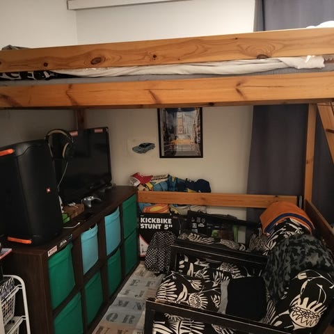 Myydään puinen (kuultovalkoinen) korkea parvisänky 120cm x 200cm nopeasti pois nurkista pyörimästä. Sängyn pohja lattiasta 154 cm korkeudella, yläreuna 186 cm.
