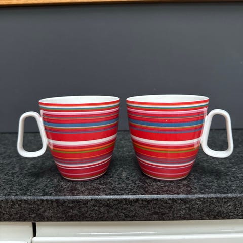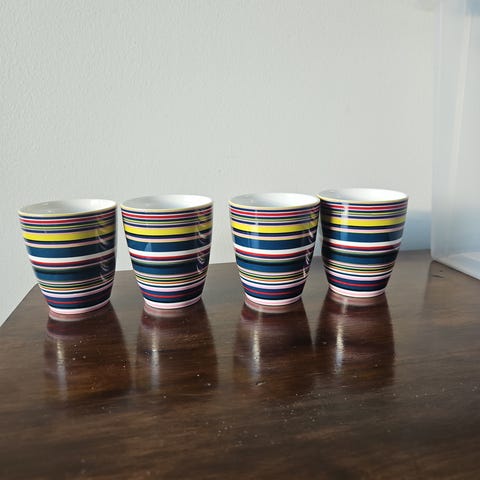 Iittala origo mukit, yhteensä neljä kappaletta. Mukit ovat monivärisiä ja valmistettu keraamisesta materiaalista. Soveltuvat käytettäväksi juomien nauttimiseen. Yhdessä mukissa on jälkiä (kts. kuva).
