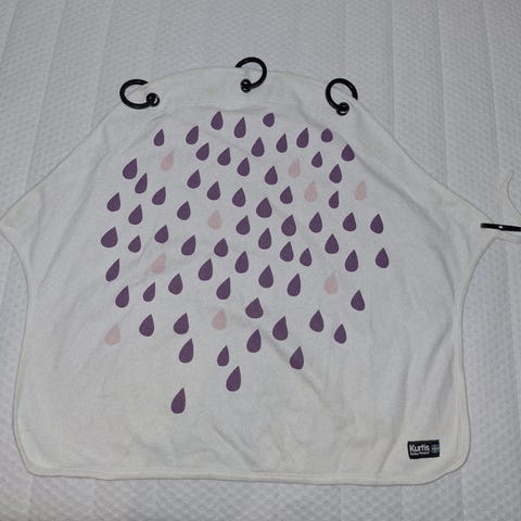 Kaunis harmaa pilvikuvioinen vaunuverho ja kuusi kiinnitysrengasta.