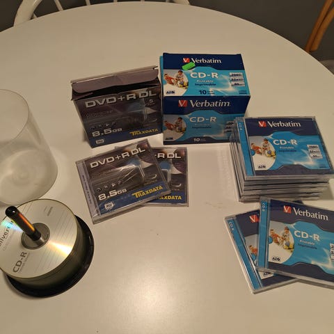 Kirjoitettavia CD-levyjä (Verbatim, Fuji DVD+RW ja Traxdata DVD-RW).