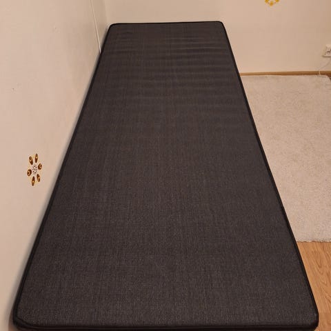 Annetaan sängynaluslaatikko (lastulevystä) ja runkopatjasänky (80x200). Rullat alla joten liukuu kevyesti sängyn alle. Jämäkkä ja kestävä.