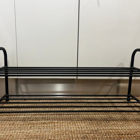 Myydään vähällä käytöllä ollut musta teräksinen kenkähylly.