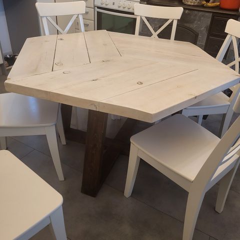 Ihana tumma lankkupöytä 4hengen. 140cm leveä. Pöydän jalkoja purtu lemmikkipupun toimesta, voi peittää esim mustalla maalilla! Nahkatuolit voi halutessaan ostaa mukaan jolloin ruokailuryhmä 220e