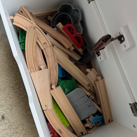 Siitä myyntiin junarata, junat ja palikoita. Käytönjälkeä löytyy ja esim puomit puuttuu mutta myös aivan ehjää tavaraa. Brion rataa ja sitten pari aitoa Brion junaa vaunuilla. Muista en ole varma. Toinen juna toimii paristoilla. Palikoilla saa tehtyä kaupungin.