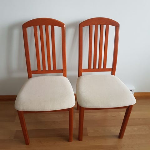 Suomessa tehty Kirsi malliston kaksi tuolia vaalealla verhoilulla,tuoleissa ei ole painaumia. Väri:kirsikka. Siistissä kunnossa,hyväkuntoiset. Nouto