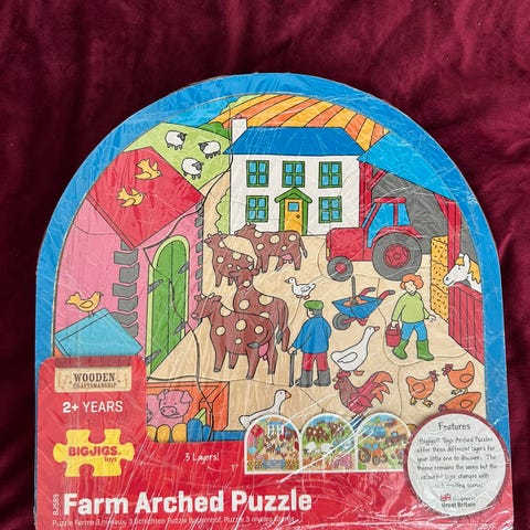 Lasten palapeli, jossa on maatila-aiheinen kuva. Palapelin osat muodostavat kuvan, jossa on maatilan rakennuksia, eläimiä ja maisemaa. Sopii lapsille ja kehittää hahmottamista ja motorisia taitoja.