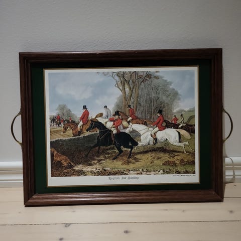 🐎 Kaunis vintage-henkinen Pimpernellin korkista valmistama tarjoilualusta, jossa on perinteinen English Fox Hunting painatus. Kuvitus perustuu John Frederick Herring Sr:n (1795-1865) teossarjaan. Valmistettu Englannissa. Siistissä kunnossa. Sopii esim. tauluksi Ralphen Lauren tyyliseen sisustukseen 🎖️