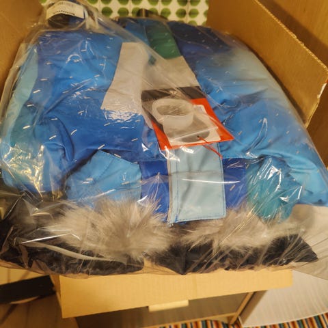 Hyvä kuntoinen ja lämmin talvihaalari. Jaloissa lumilukot ja neppari, toinen jalka lenkki puuttuu. Vetoketjutaskut sivuilla, rinnassa ja toisessa hihassa. Polvissa tai pepussa ei ole karheumaa / kulumaa kankaassa. Koko on ennemmin reilu kuin pieni.