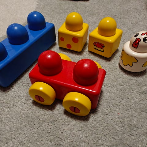 Sekalainen kasa Duplo-palikoita, noin 100kpl. Mukana pikkuinen lentokone, ankkahelistin ja pieni alusta. Säilytyslaatikko mukaan. Palikat ovat hyvässä leikityssä kunnossa. Palikoita ei ole pesty. Vain nouto Asolasta.