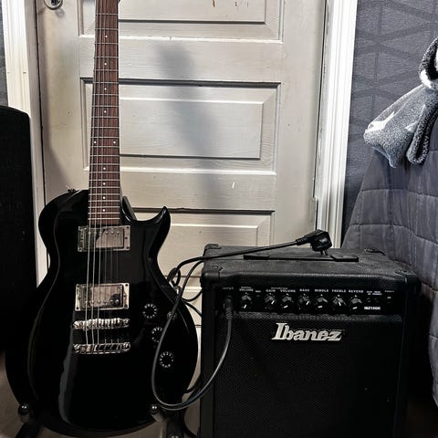 Omat kitarat olleet suurimmaksi osaksi ibanezeja, sekä muutama strato ja niihin verrattuna, tämä on ollut oikein käteen sopiva. Paino ~3.9kg.