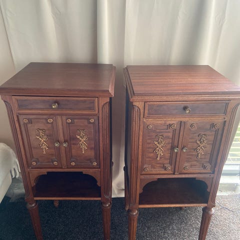 Myyn vain yhdessä eli hp on yhteishinta. Yöpöydissä laatikko ja avohylly. Pöydät ovat hyväkuntoiset korkeaan ikäänsä nähden, jonkun verran patinaa pinnoissa löytyy.