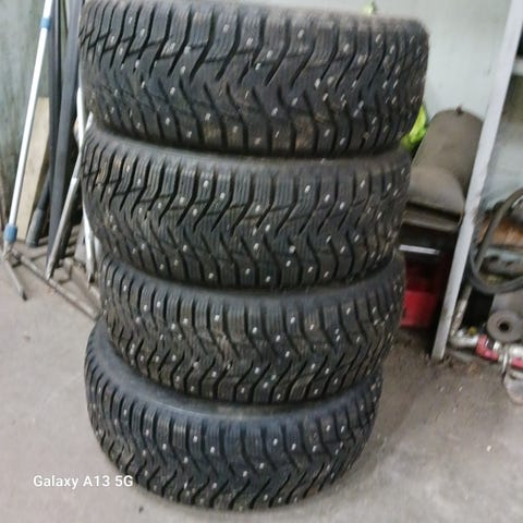 Siinä olisi hyvät talvirenkaat yks kulunu ihan reunasta ei haittaa käytössä tasasesti 6-7milliä pintaa taitaa olla kaikki nastatkii paisto 16 mikkelistä löytyy