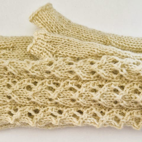 Käsineet melkein kuin lapaset, lämmittää käsiä, mutta jättää sormenpäät vapaaksi. Käytä sormikkaiden kanssa tai ilman. Pitsi ranteesta lähtien koko matkan, sormien kohdalla lyhyt resori. Kämmenen sisäpuoli sileää neulosta. Peukalot neulottu noin kynteen saakka.