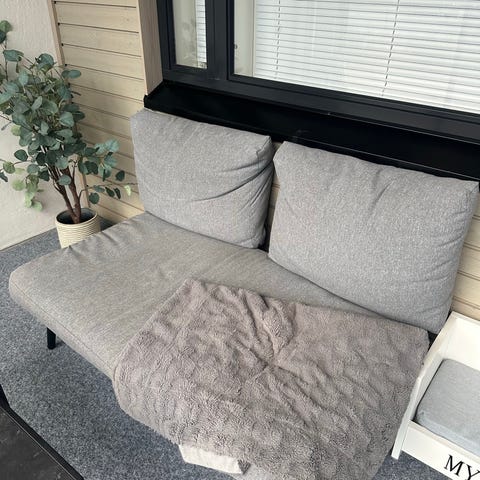 Monikäyttöinen puulava myynnissä, käytetty parvekesohvana. Lavassa on pyörät alla, joten helppo liikutella.