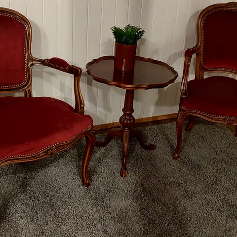 Myydään kaksi antiikkituolia (yhdessä). Toisen tuolin istuinosan kangas on hieman kulunut. Muuten ovat erinomaisessa kunnossa. Kankaat ovat vaihdettavissa.