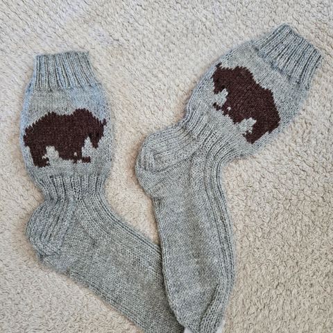 Käsin neulotut harmaat villasukat koko 43, varsissa pääkallokuviot