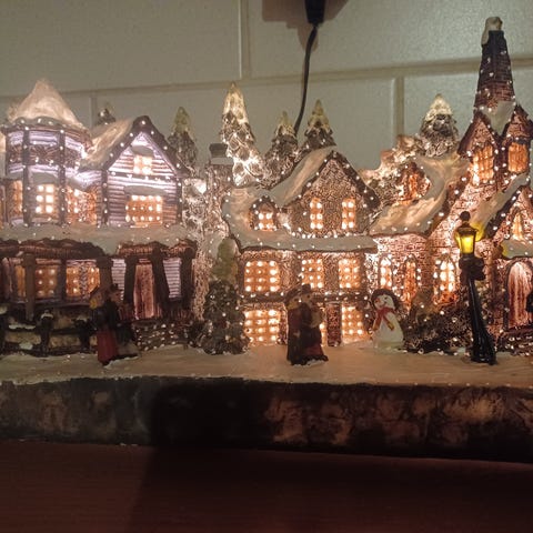 Kuvan mukainen joulukyläkoriste. Valoilla, liikkuvilla hahmoilla ja joulumusiikeilla (8 biisiä, saa kytkimestä hiljaiseksi). Virtajohto mukana, toimii myös AA-paristoilla. Testattu toimivaksi. Maksanut uutena 115€.