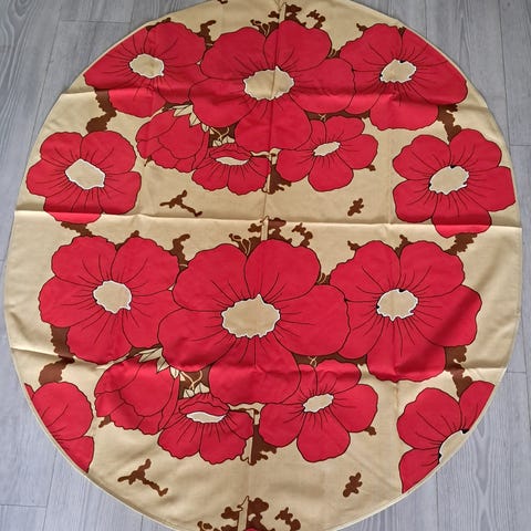 Valkoinen pöytäliina, koko 118 x 115 cm. Liina on käyttämätön (hintalappukin vielä paikoillaan), mutta vuosikymmeniä vanha.