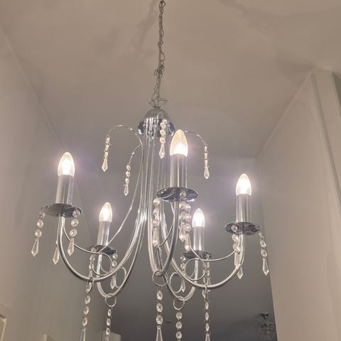Upouusi kattokruunu, joka on ostettu, mutta jota ei ole koskaan asennettu tai käytetty. Ei sisällä lamppuja. Asennetun ja kiinnitetyn kattokruunun kuva on otettu verkkosivustolta, josta se ostettiin.