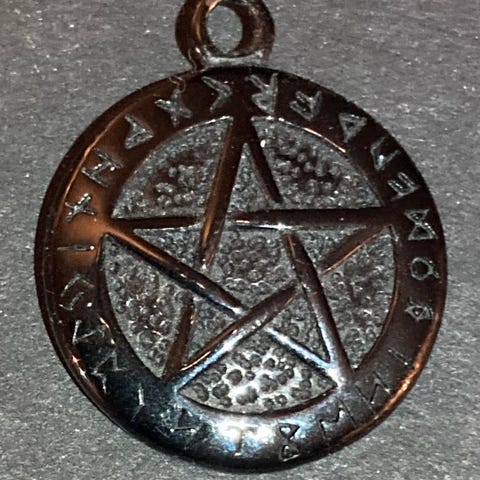 Myynnissä musta metallinen pentagrammi-kaulakoru ketjulla. Avoin ja selkeä design, sopii hyvin gootti-, metalli- ja vaihtoehtoiseen tyyliin. Materiaali metalliseos, ei hopeaa. Ketju ja lukko ehjät, käytetty mutta hyväkuntoinen.