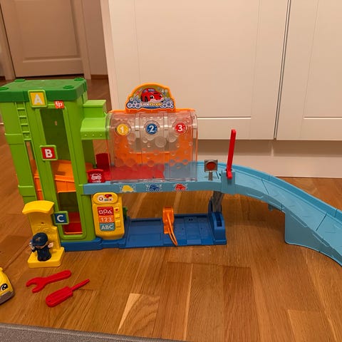 Fisher-Price Little People leikkisettu sisältää värikkään ramppirakenteen, josta autot voivat liukua alas. Mukana kolme erilaista leikkiautoa ja hahmoa. Korkea rakennelma, joka ollut meillä yksi pienen ihmisen lemppareista.