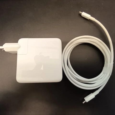 Applen 61 W USB-C-virtalähde. Hieman johdot tummuneet kovassa käytössä. Mutta toimii kuten pitääkin.