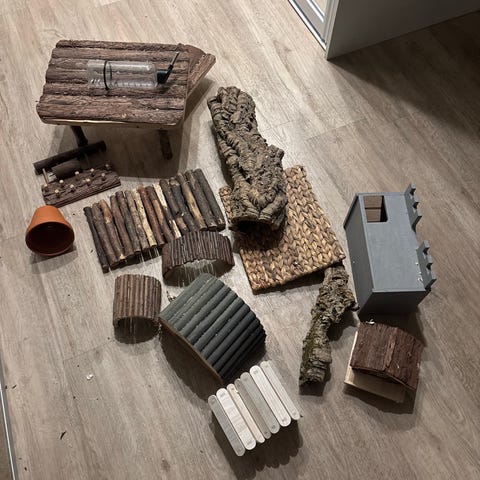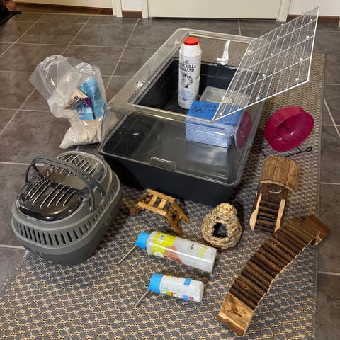 Iso itse tehty asumus hamsterille tai muulle pieneläimelle. Ei kaikista tukevin. Purut eikä tarvikkeet tule mukaan