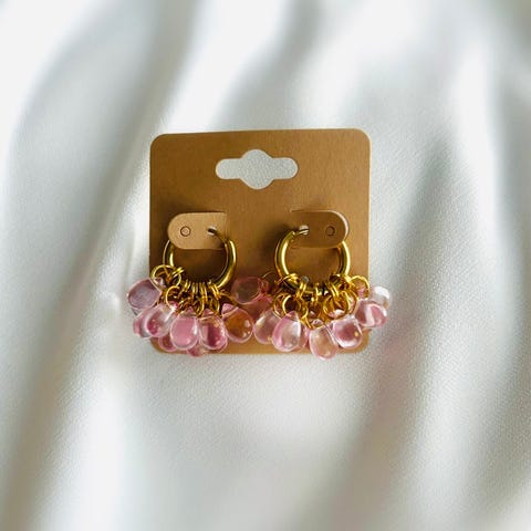 Pisararypäs-korvakorut kirkkaan värisillä lasipisaroilla ja hopeansävyisillä metalliosilla. Allergiasoimaton rengas. Sirot, kokonaispituus noin 2,5cm.