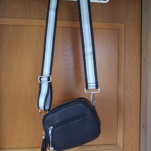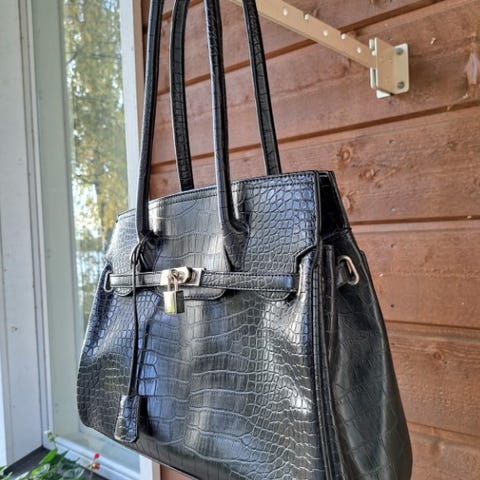 Musta olkalaukku korkeus noin 31 cm ja leveys noin 41,5 cm. Pohjan ulkomitat 41,5 cm x noin 21 cm. Kuin uusi.