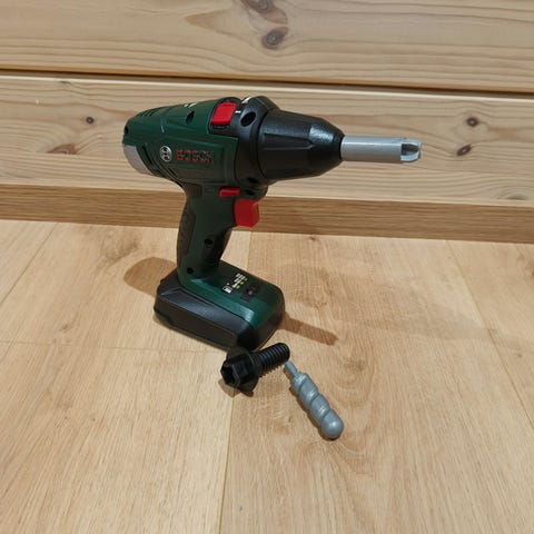 Aloittelevalle rakentajalle monipuolinen lelutyökalusetti, jossa toimiva paristokäyttöinen Bosch "akkuporakone" suunnanvaihdolla. Sillä on näppärä kiinnitellä mukana tulevia palikoita muovipulteilla ja muttereilla. "Varaporakoneessa" mekaaninen liipaisin, jolla terää voi pyöritellä. Paljon muutakin hyödyllistä ja jänskää!