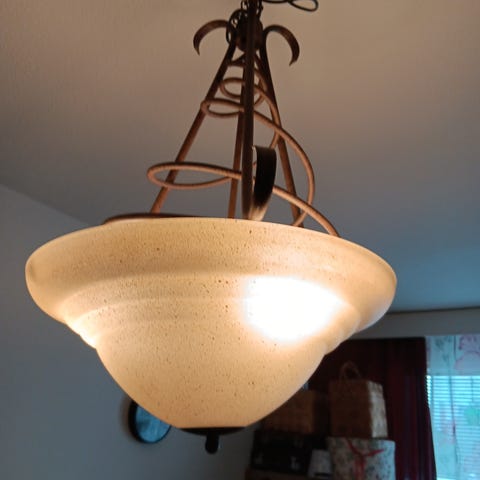 Kuvan mukainen lasinen pitsikuvioitufoldi. Halkaisija 50 cm. Kattokoukku ja pistoke.