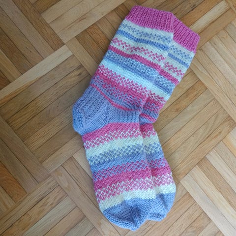 7 veljestä langasta neulotut sukat. Terän pituus 24 cm.