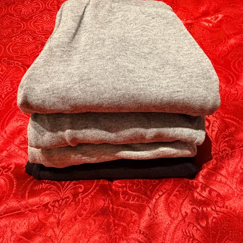 Myydään siisti ja käytännöllinen setti: ruskeat housut, vaalea liivi sekä kaksi valkoista kauluspaitaa.