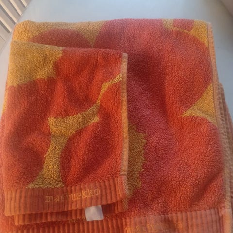 Myydään 2 kpl kylpypyyhettä ja 2 kpl vieraspyyhettä settinä. Kylpypyyhkeet ovat kooltaa 75 x 150 cm ja vieraspyyhkeet 30 x 50 cm. Molemmissa pyyhkeissä toisella puolella paksummat raidat ja toisella puolella ohuemmat. Väreinä musta ja tumman harmaa (kuva vääristää mielestäni harmaan sävyn liikaa ruskeaan taittavaksi). Mukaan saa halutessaan Marimekon paperikassin.