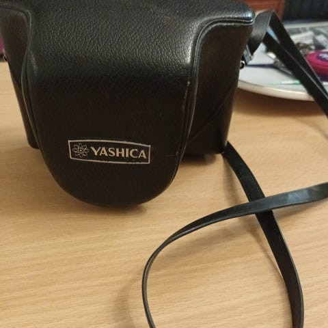 INF Yashica Kamerakamera, jossa on musta nahkakotelo. Kamera on mekaaninen ja sopii valokuvaukseen. Nahkakotelo suojaa laitetta ja helpottaa kantamista.