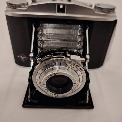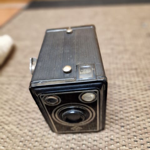 Agfa Box 44 kameran ruskeassa suojakotelossa. Kamerassa on yksinkertainen linssi ja se on valmistettu metallista ja muovista. Sopii perinteiseen valokuvaukseen.