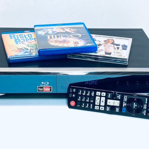 3D bluray soitin, kaukosäädin ja kotiteatterikaiuttimet sekä subwoofer.