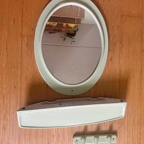 Vaaleansiniset kylppäritarvikkeet: Peili, naulakko, kaksi lamppua ja hylly.