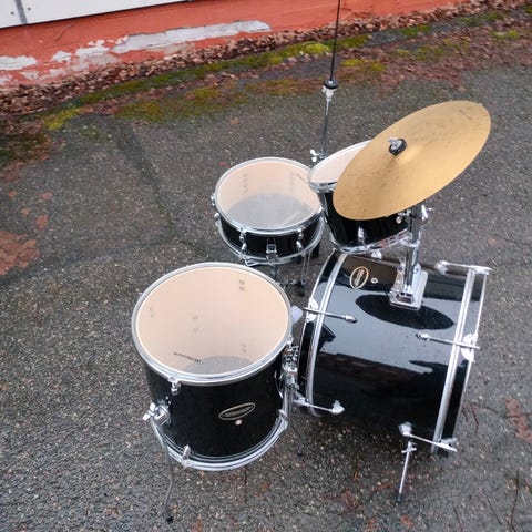 Bassorumpu 16 tuumaa, pikkutomi 10 tuumaa, lattiatomi 12 tuumaa sekä pikkurumpu 12 tuumaa.