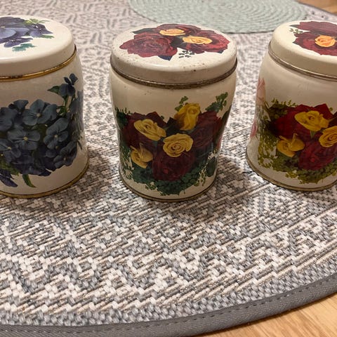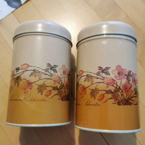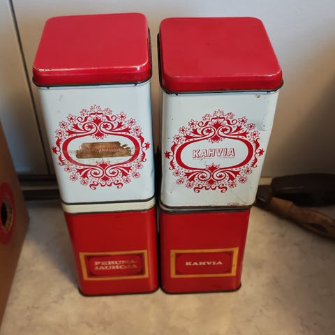 Kuvan mukaiset retropeltipurkit vaikka hyllyä koristamaan.Kolhuja ja naarmuja löytyy,ikäisekseen hyvässä kunnossa.Pohjassa lukee Japan (korkeammissa purkeissa).Yhteishinta 30e.