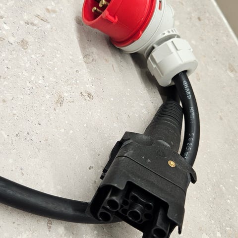 Audin kompakti latausasema schuko-pistotulpalla, pituus 7 metriä, valmistettu 2023. Tähän saa hankittua schuko-johdon tilalle laitteeseen sopivan voimavirta-kaapelin/adapterin.