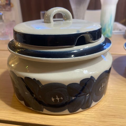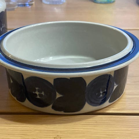 Myydään Arabia Anemone kulho ilman kantta, halkaisija 18cm ja korkeus 10cm. Kulho on valkoinen, jossa on sininen koristekuvio. Uudenveroinen kunto.