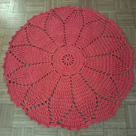 Trikookuteesta virkattu matto. Väri sinimusta. Halkaisija 89cm.