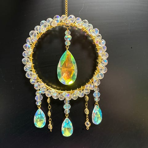Kaunis pieni auringonsieppari vaikka ikkunaan. Kokonaispituus noin 13cm ja leveys 9cm + ketju ja koukku.